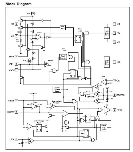 IR2166SPBF features: (1)PFC, Ballast control and half-bridge driver in one IC; (2)Critical conduction mode boost type PFC; (3)No PFC current sense resistor required; (4)Programmable preheat frequency; (5)Programmable preheat time; (6)Programmable run frequency; (7)Programmable over-current protection; (8)Programmable end-of-life protection; (9)Programmable dead time; (10)Internal ignition ramp; (11)Internal fault counter; (12)DC bus under-voltage reset; (13)Shutdown pin with hysteresis; (14)Internal 15.6V zener clamp diode on Vcc; (15)Micropower startup (150μA); (16)Latch immunity and ESD protection; (17)16-Lead PDIP also available LEAD-FREE.